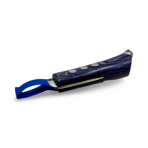 The Beanie Small Loop Knife with Flick Groover is a super strong loop knife with a purple laminated handle. It is a small loop with a narrow shape loop blade that will easily get to the bottom of the medial and lateral frog clefts. It is fitted with a flick groover which is designed to remove the hoof from beneath the nail during the clenching process.